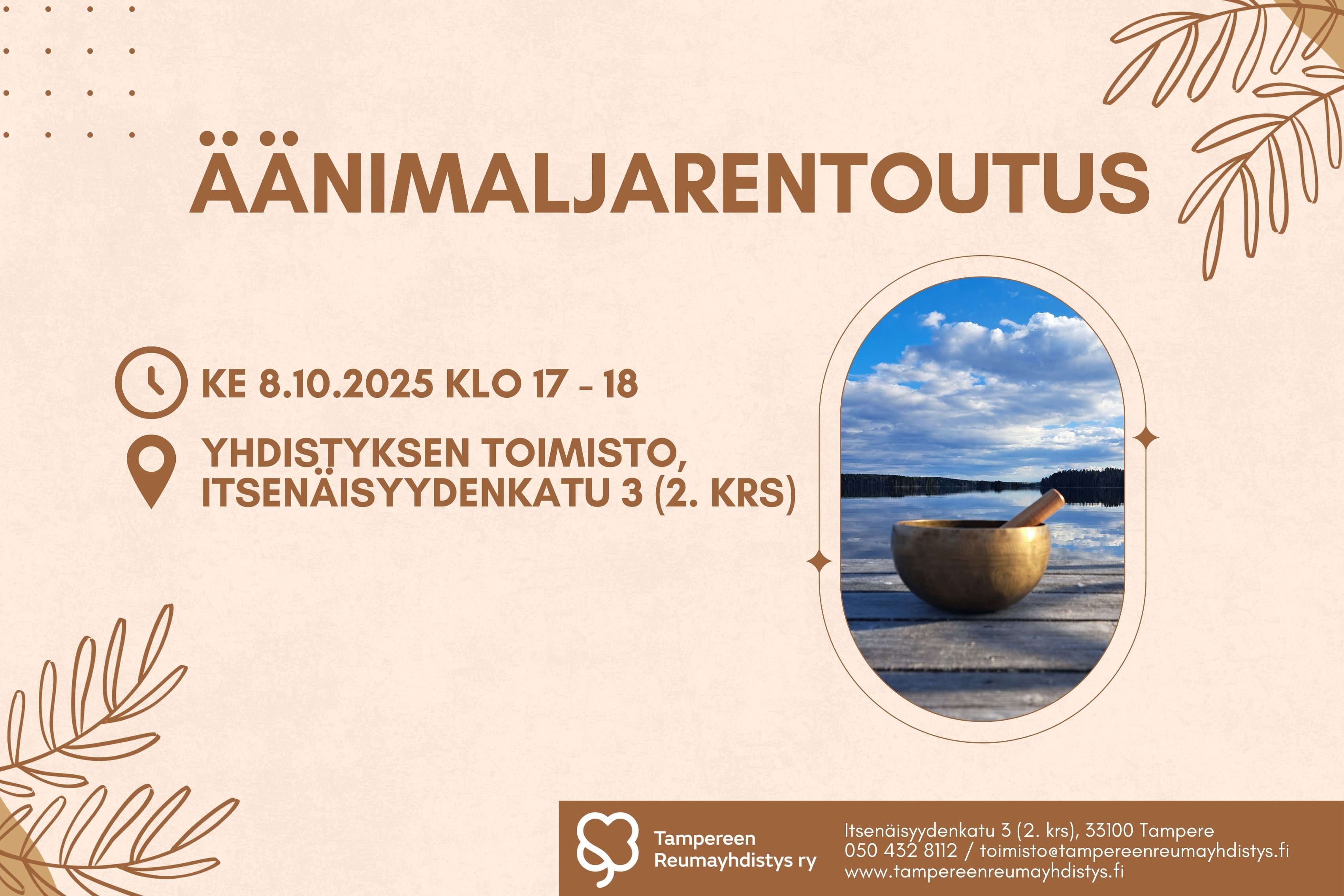 Ota halutessasi mukaan oma jumppapatja (muutamia löytyy toimistolta), tyyny ja viltti sekä pukeudu lämpimästi. Esteenä äänimaljarentoutukselle on syövän sairastaminen ja meneillään olevat syöpähoidot, sydämentahdistin ja sydänongelmat, epilepsia sekä raskauden ensimmäinen kolmannes. Halutessaan rentoutuksen voi tehdä myös tuolilla istuen.