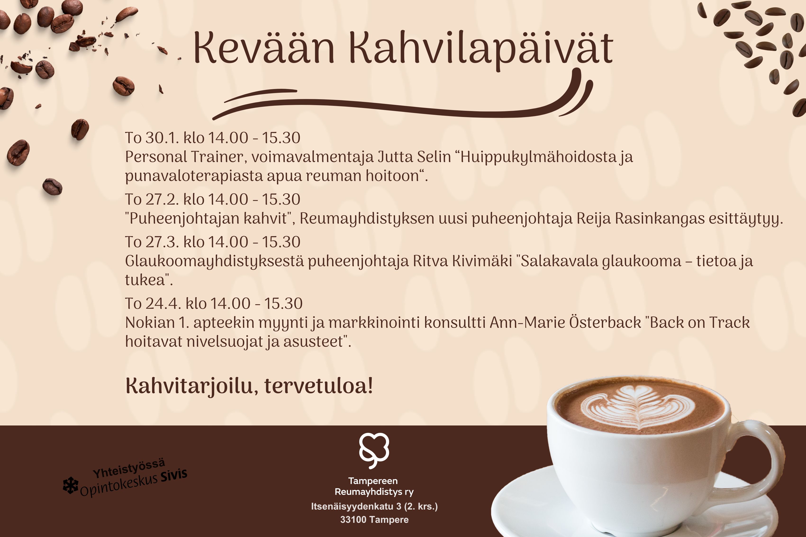 To 27.2. klo 14 – 15.30 "Puheenjohtajan kahvit", Reumayhdistyksen uusi puheenjohtaja Reija Rasinkangas esittäytyy.