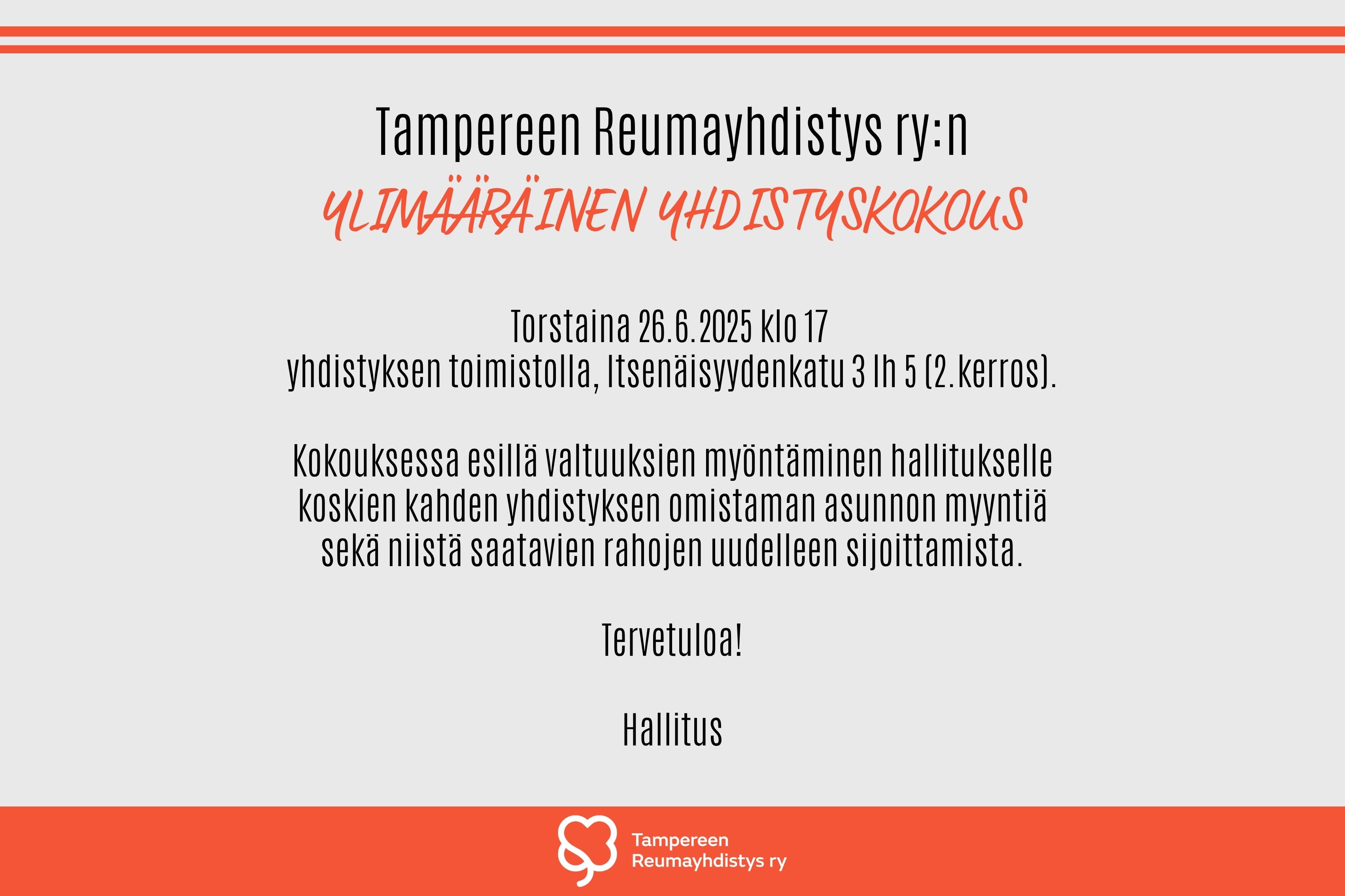 Tampereen Reumayhdistys ry:n YLIMÄÄRÄINEN YHDISTYSKOKOUS pidetään torstaina 26.6.2025 klo 17 yhdistyksen toimistolla, Itsenäisyydenkatu 3 lh 5 (2.kerros).